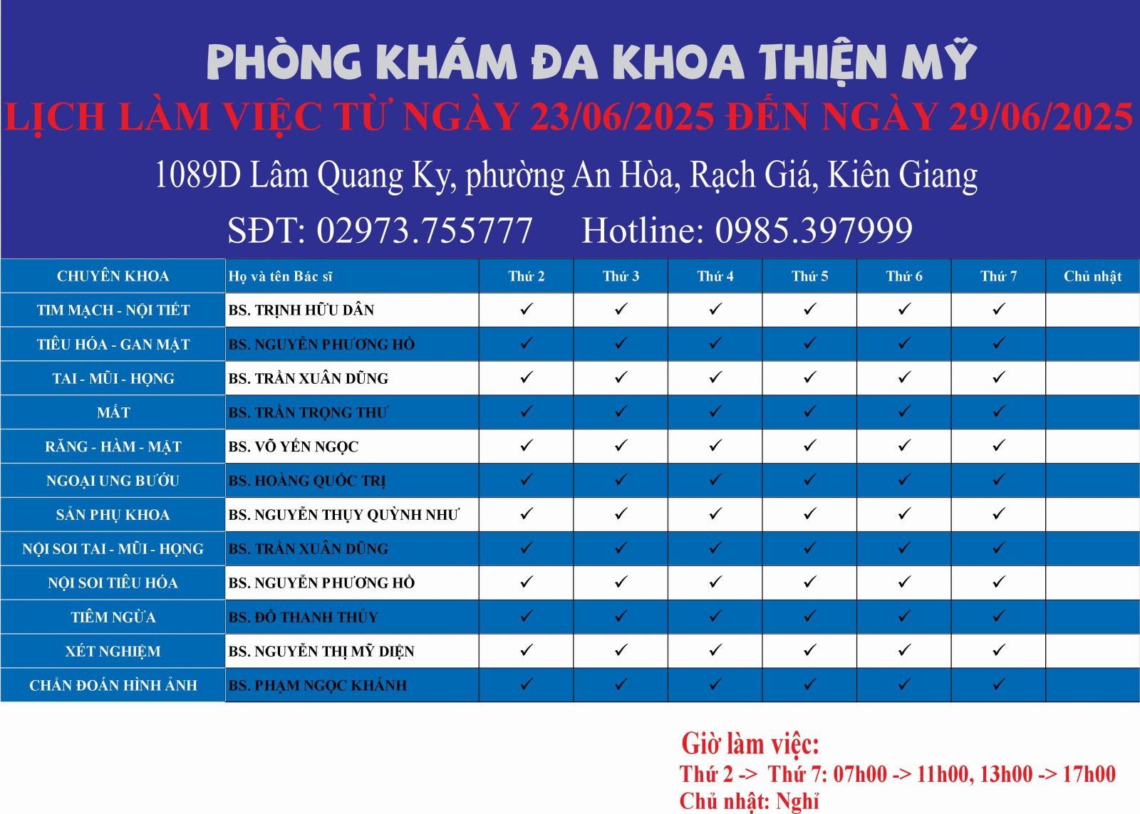 Thứ Hai - Thứ Bảy : 07.00 - 17.00Chủ nhật: 07.00 - 11.00