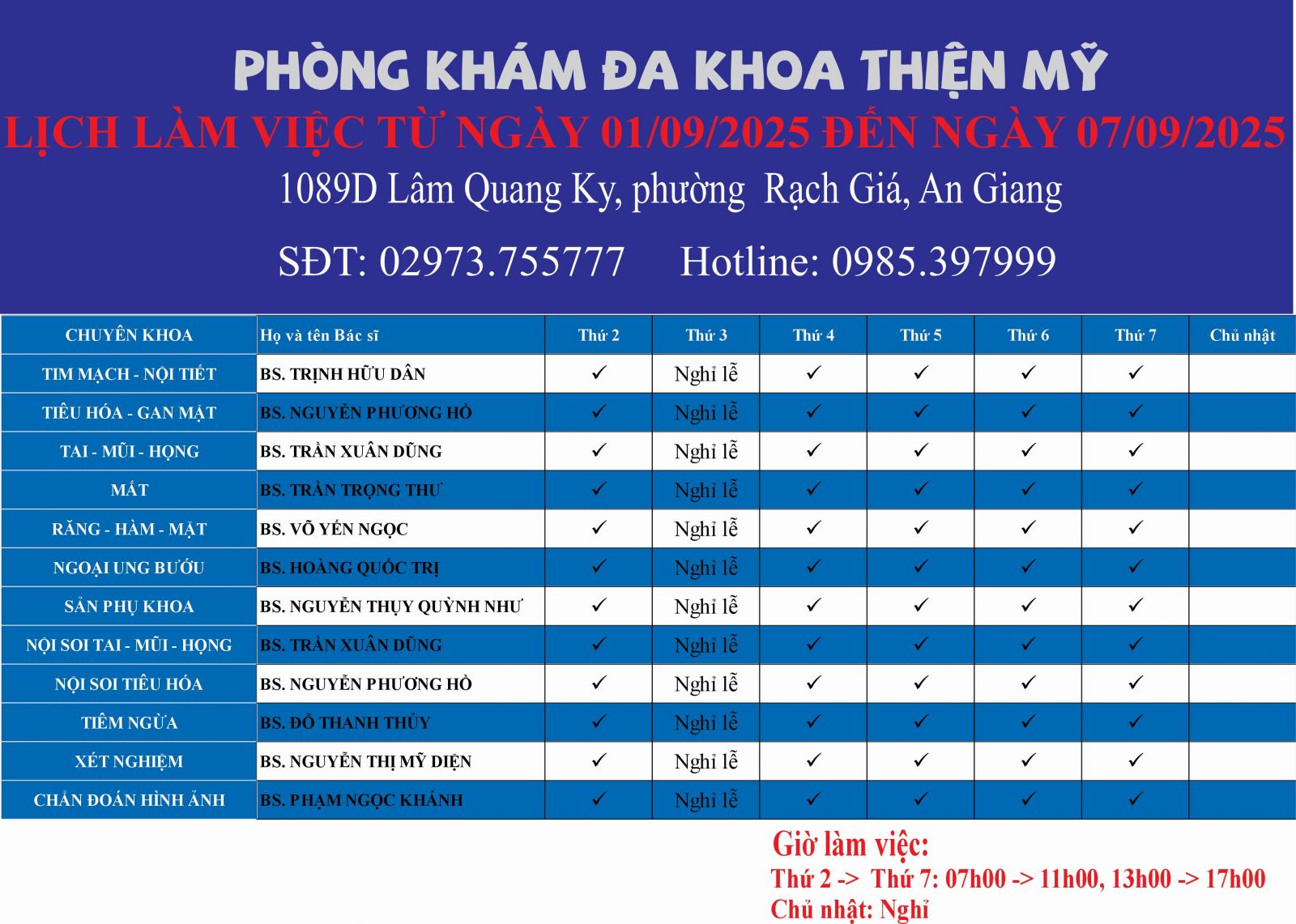 LỊCH LÀM VIỆC TỪ NGÀY 01/09/2025 ĐẾN NGÀY 07/09/2025