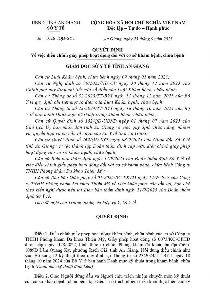 QUYẾT ĐỊNH VỀ VIỆC ĐIỀU CHỈNH GIẤY PHÉP HOẠT ĐỘNG ĐỐI VỚI CƠ CỞ KHÁM CHỮA BỆNH