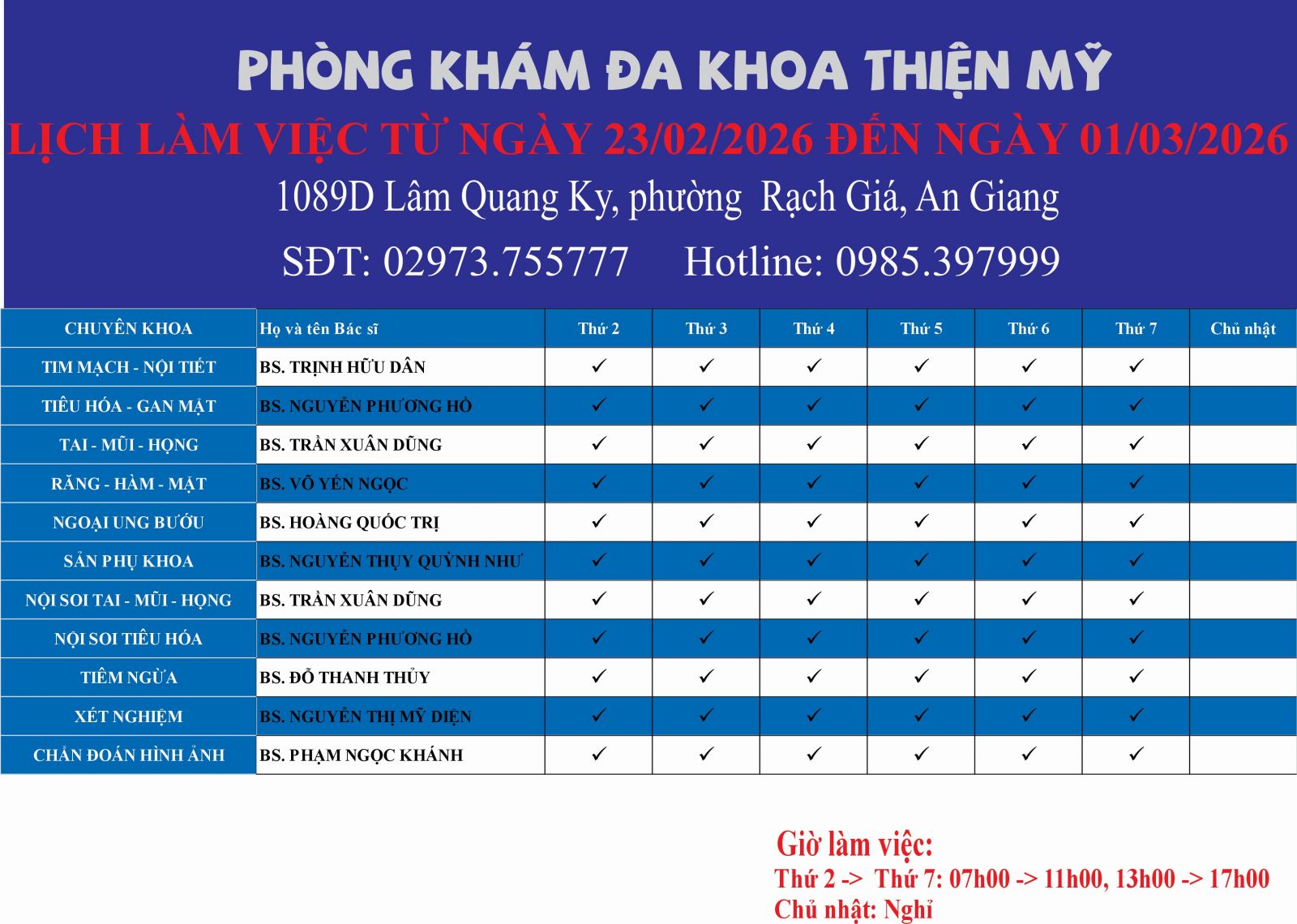 Thứ Hai - Thứ Bảy : 07.00 - 17.00Chủ nhật: 07.00 - 11.00